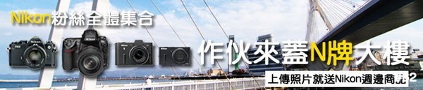 各位捧油,你是Nikon的粉絲嗎?現在我們要集結Nikon粉絲的力量,合力蓋一棟Nikon相機的專屬大樓,展現Nikon的超強人氣,只要你拿的是N牌的相機,不管是DSLR、小DC還是底片機,通通都歡迎參加喔!