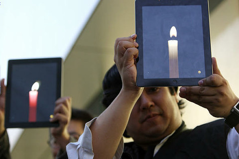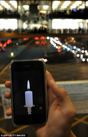 ↓銀座的 AppStore 也充滿許多哀掉的鮮花,有粉絲們也利用iPad上的蠟燭來哀悼賈伯斯