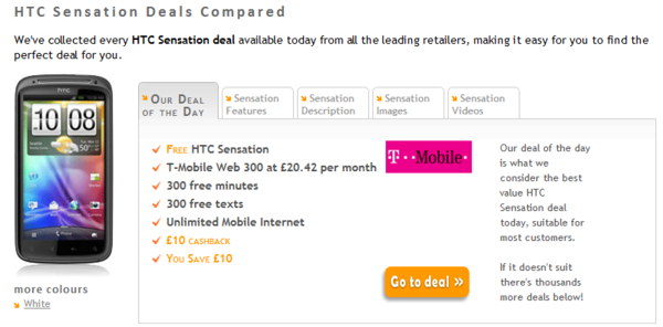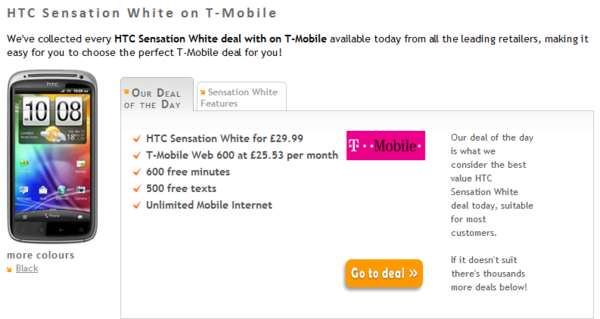 ▲ 黑色版本的月繳 816 台幣左右即可將 Sensation 免費帶回家,還有 400 台幣左右的回饋。當然方案內容也不相同,但大體看起來白色還是比黑色來得高貴一些----白色有加分?(來源:MyMobileDeal)