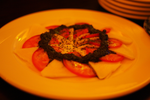 ▲ 蕃茄起司拼盤,上頭有一圈醬料,我猜是菠菜醬。單吃起司配啤酒其實就十分對味了,配上蕃茄吃又是不同的感覺。