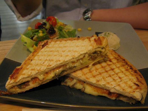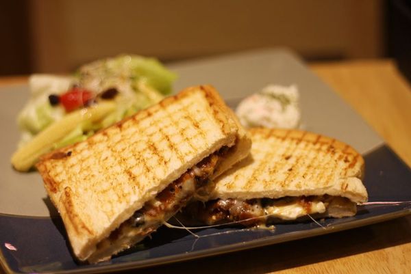 ▲ 說不便宜其實也不會,餐點與飲料頂多一百元出頭,最貴的焗烤義大利麵或是調酒等才會上兩百。皮蛋豆腐熱壓土司,附上馬鈴薯泥與油醋沙拉。土司裡頭放入起士、皮蛋、豆腐等配料,皮蛋原本獨有的臭味被起士所掩蓋,好味道顯了出來,與稱職的綠葉--豆腐三者非常搭配,就算不喜歡皮蛋的朋友也會開心的吃!