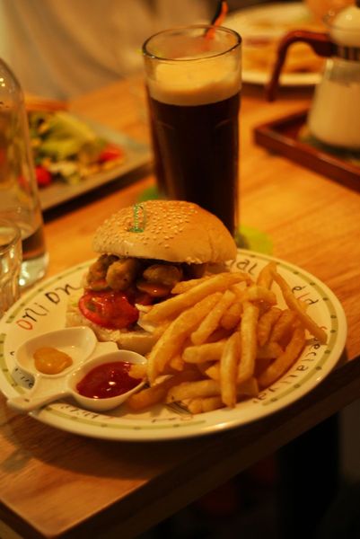 ▲ 日式柚子醬鮮蚵漢堡,薯條是脆皮薯條,量非常多,漢堡本身也非常大,以我自己的印象來說應該比師大的 Evans 漢堡或是樂子都還要大與多。附上黃芥末與蕃茄醬。我的飲料是黑啤冰咖啡,有著啤酒的順口口感,但又有著黑咖啡的韻味與香氣,非常調和的一品。