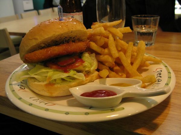 ▲ 當天點的泰式酸辣魚排漢堡,漢堡與薯條的份量與上次一樣給得非常多,就連我這大食客也吃得非常飽,豎起大拇指。