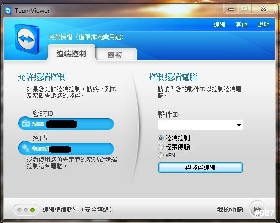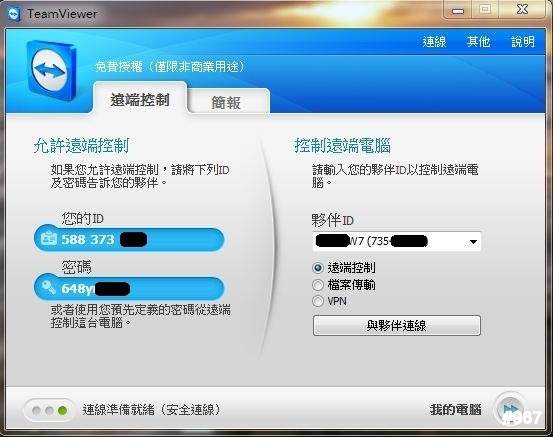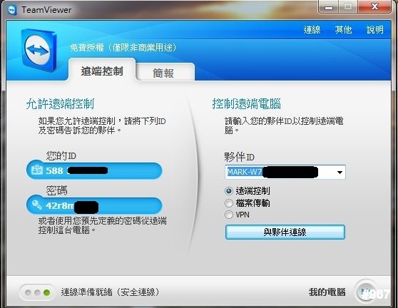 ▲ 這是被控端電腦的顯示畫面,將左側ID與密碼(密碼每次隨機產生)輸入到手機(ID不會變,密碼也可以設定固定密碼)