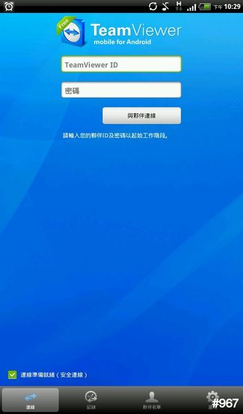 ▲ Android程式開啟時的連線畫面,會要求輸入被控端的ID與密碼(會自動記錄輸入過的ID)