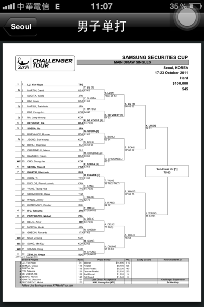 籤表的型式,這算是創台灣網壇紀錄,在2011/10所舉辦的三星首爾挑戰賽,首次出現台灣選手爭奪冠亞軍的情況,當然,最後由一哥勝出。