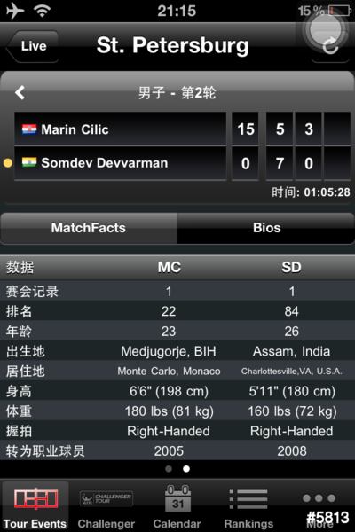 這就是Live畫面,可看到每球的比數與各項統計數據,與比賽二者的基本資料。
