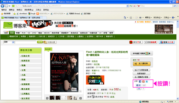 【活動方法】請到以下網址(博客來《Flash!超閃時尚人像—活用光與影的閃燈×棚燈魔術》商品頁)按下右方的「讚」(如下圖所示),並回到本篇文章回覆「我已完成任務,我的FB網址是:http://xxxxxxxxxxxxxxxxxxxxxxxx」即具抽獎資格。