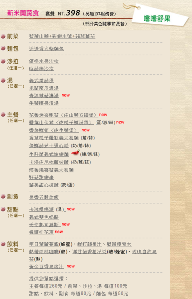 ▲ 菜單。可以看到主力放在主菜部份,每一道菜都有一定水準,幾乎沒有地雷(但味覺還是主觀的)。(來源:舒果網站)